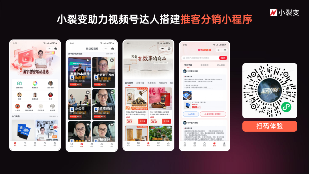 小裂变·推客分销系统助力视频号达人搭建推客分销小程序。
