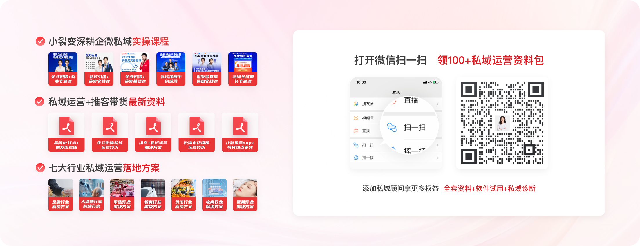 视频号裂变、视频号分销、视频号订单三大功能模块,助力品牌、门店、达人做好视频号,实现流量增长、销量增长、打通企业微信私域的运营目标。