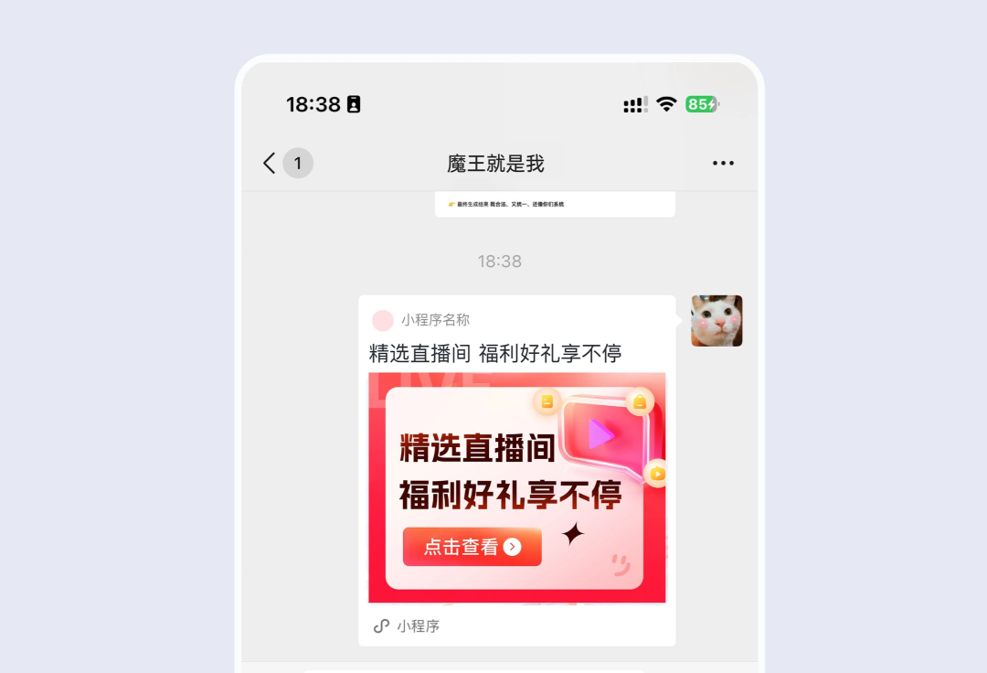 分享卡片自定义:可设置转发直播间的分享卡片样式,吸引客户点击卡片进入直播间观看直播。