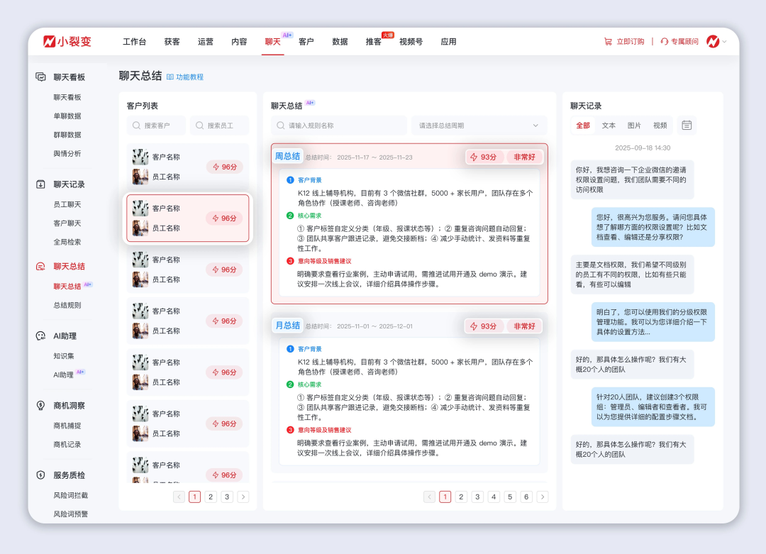 小裂变聊天总结功能全新升级,AI自动按周期总结聊天关键信息、自动对聊天情况进行评分评级,辅助销售、管理者跳过聊天信息筛选环节,快速掌握核心关键信息,让管理决策更高效、服务优化更精准。