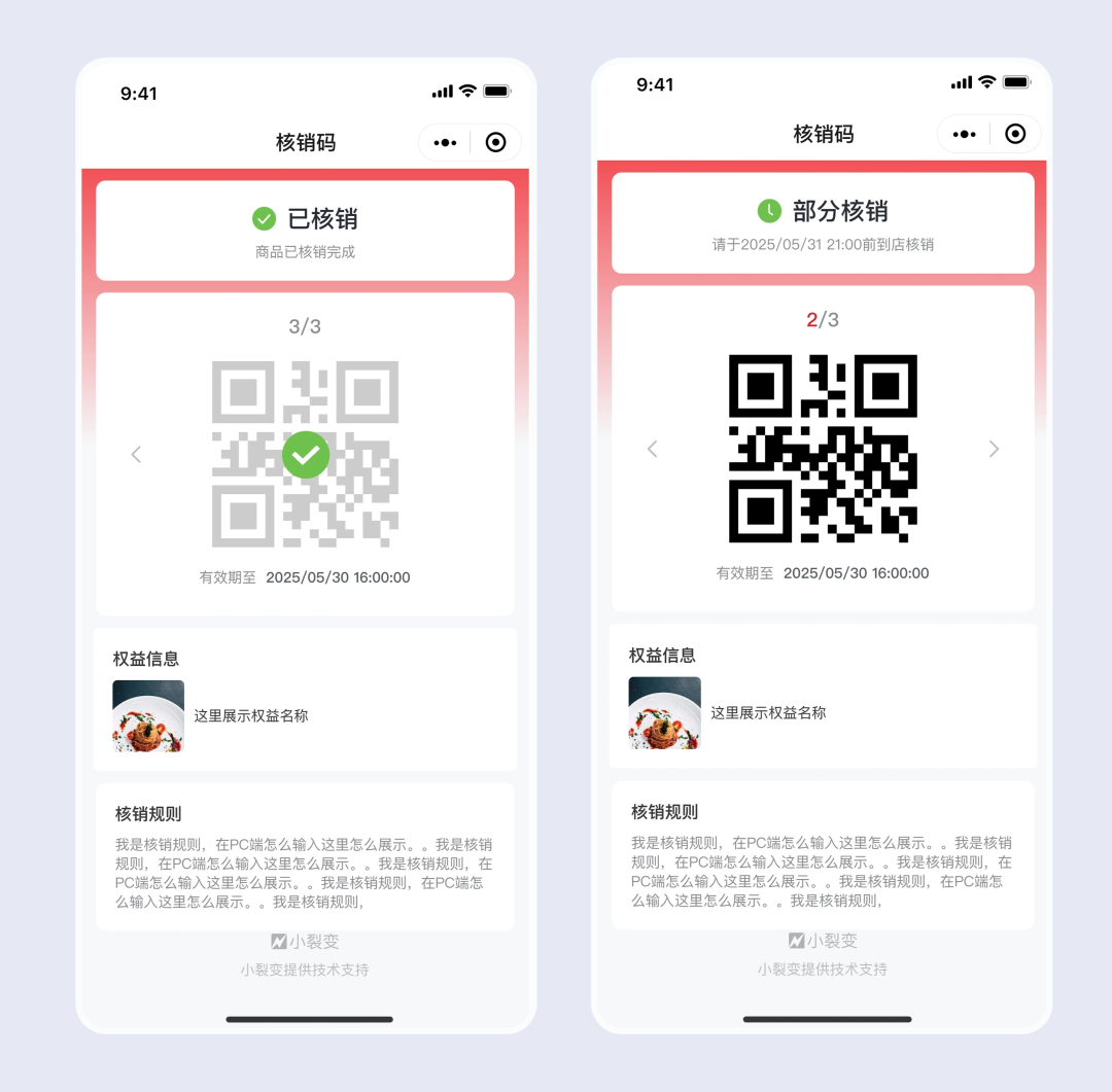 单次核销:核销后自动作废,适合单次体验券、新人到店礼等场景,比如餐饮门店的 “新人到店免费小吃” 核销码,使用一次即失效。