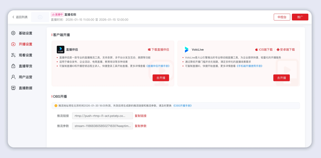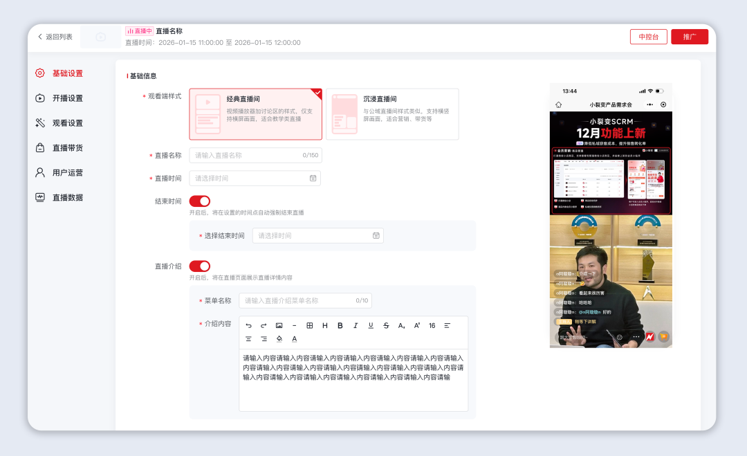 基础信息配置:可自定义直播名称、开播时间,支持设置自动结束时间,到点后直播自动关闭,无需手动操作。