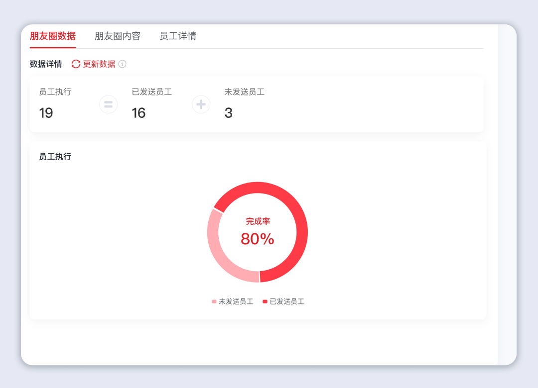 小裂变群发(客户群发、客户群群发、发布朋友圈)数据展示功能升级,将员工执行数据、客户接收数据集中展示,无需跨模块查找,省去大量筛选时间。
