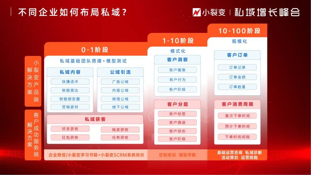 基于此,小裂变团队也针对不同的阶段的客户,提供不同的产品+服务解决方案。