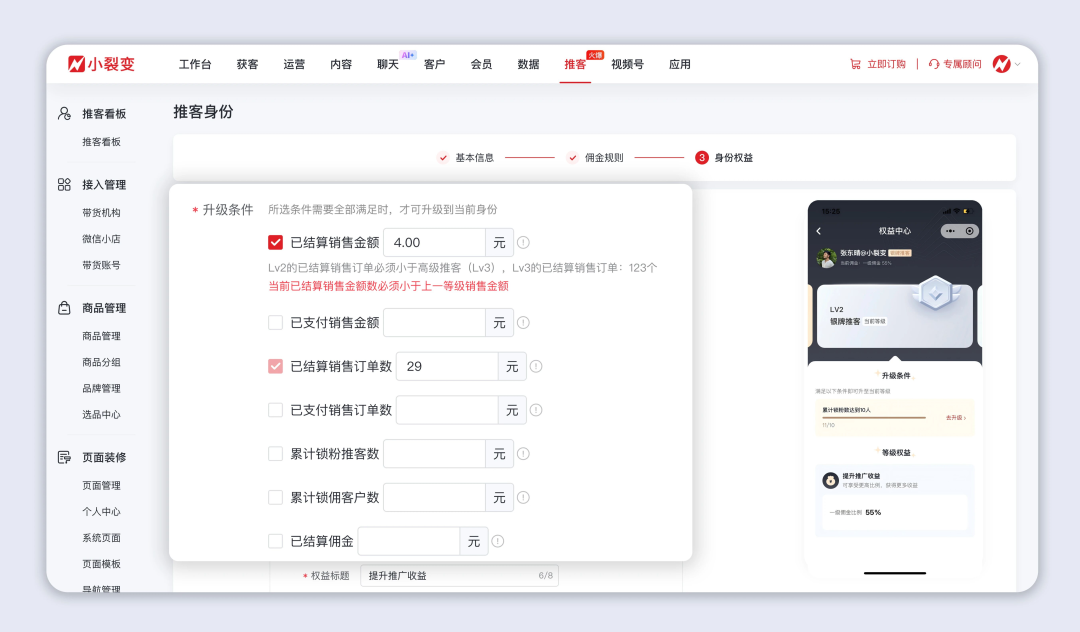 将这3项指标配置为升级条件,推客达标后系统自动完成身份升级,同步解锁更高的佣金、专属奖励等权益 ,带货动力拉满。