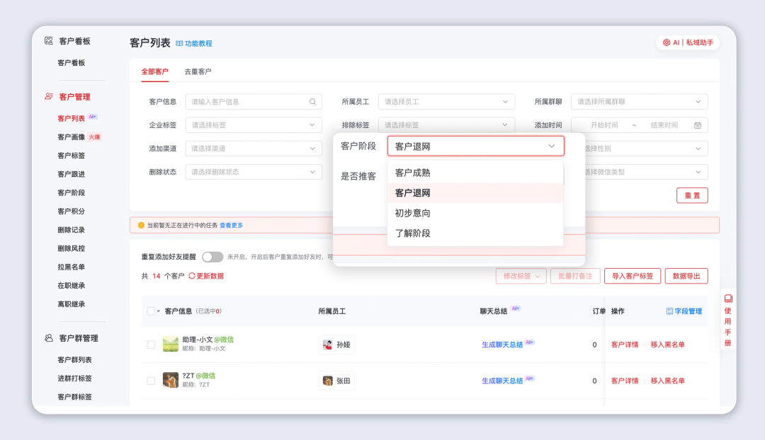 比如,统计 “初步了解” 阶段客户占比过高时,可优化前端引流与初步沟通策略,让管理决策更有依据,推动私域销售高效推进。