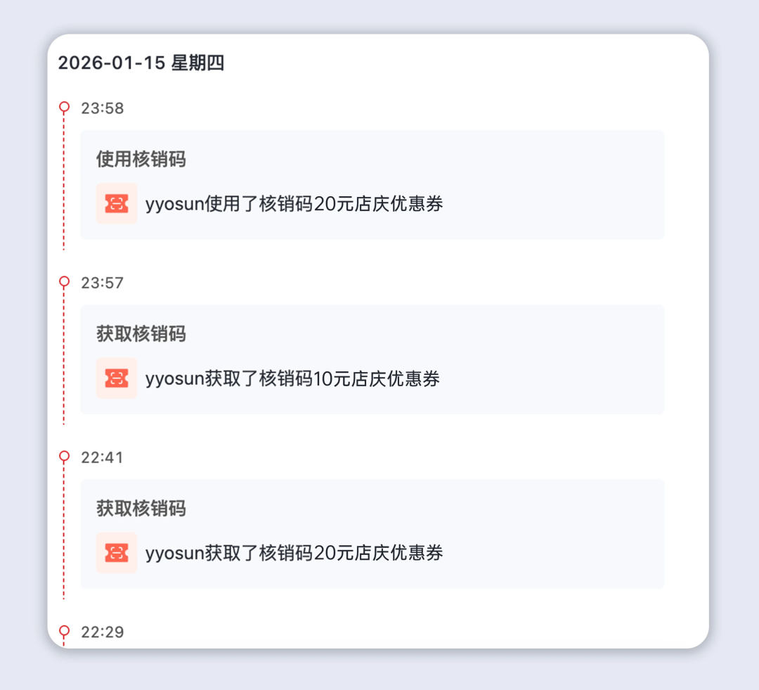 单次核销:核销后自动作废,适合单次体验券、新人到店礼等场景,比如餐饮门店的 “新人到店免费小吃” 核销码,使用一次即失效。