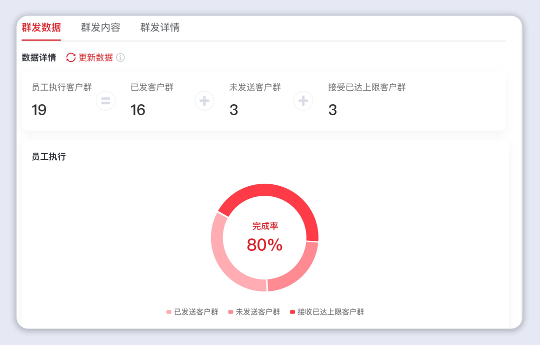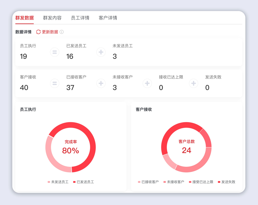 小裂变群发(客户群发、客户群群发、发布朋友圈)数据展示功能升级,将员工执行数据、客户接收数据集中展示,无需跨模块查找,省去大量筛选时间。