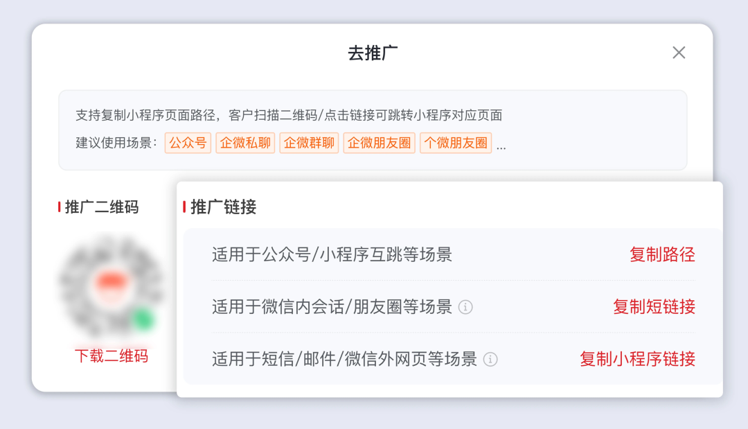 多渠道推广直播间:进入直播管理-直播列表,点击「推广」,可生成推广二维码及链接,在公众号、企业微信朋友圈/社群等多渠道推广直播间。