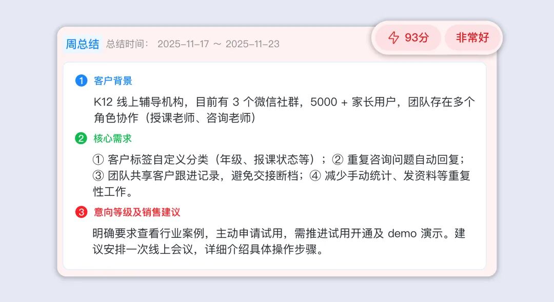 80-100 分为 “非常好”,50-80 分为 “一般”,0-50 分为 “有待提升”。方便运营、管理人员快速筛选优质跟进案例或需要优化的服务场景。比如,发现某员工多条聊天总结评分低于50分,可针对性开展话术培训。