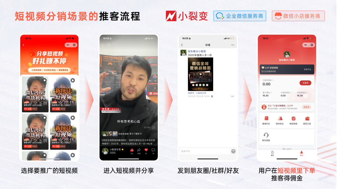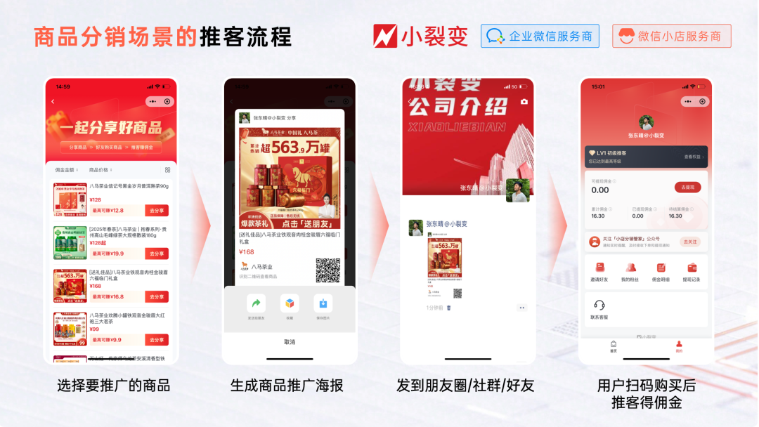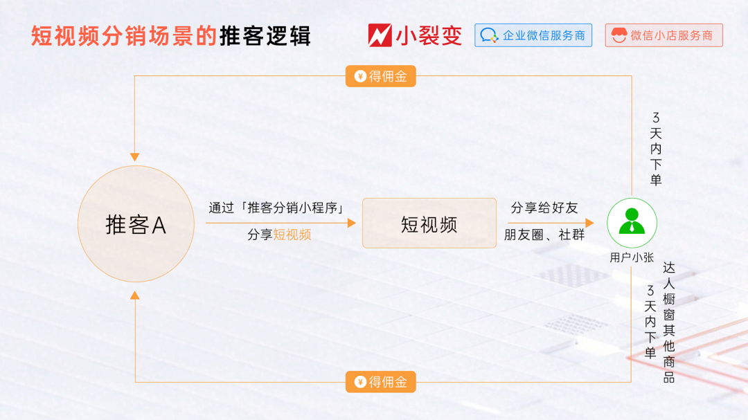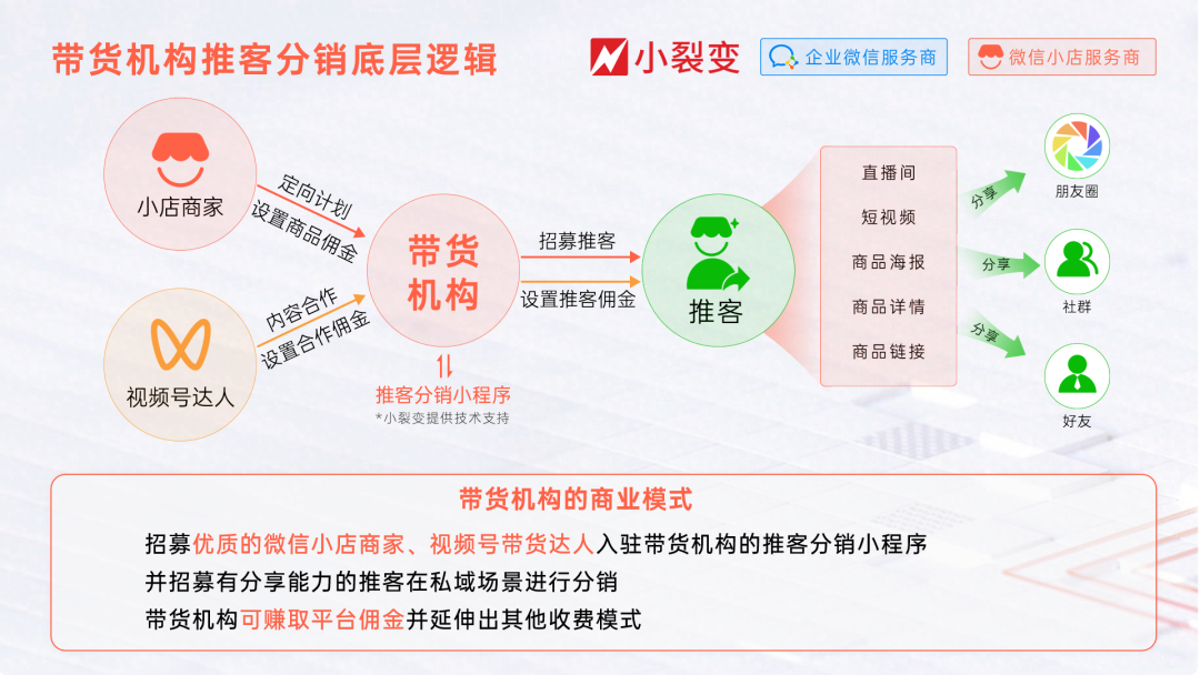 淘宝客、私域团长等机构接入小裂变·推客分销系统后,可招募推客参与带货(分销),推客将商品海报/详情/链接、直播间、短视频等分享至朋友圈/社群/好友,好友下单且订单完成后,推客可获得佣金。
