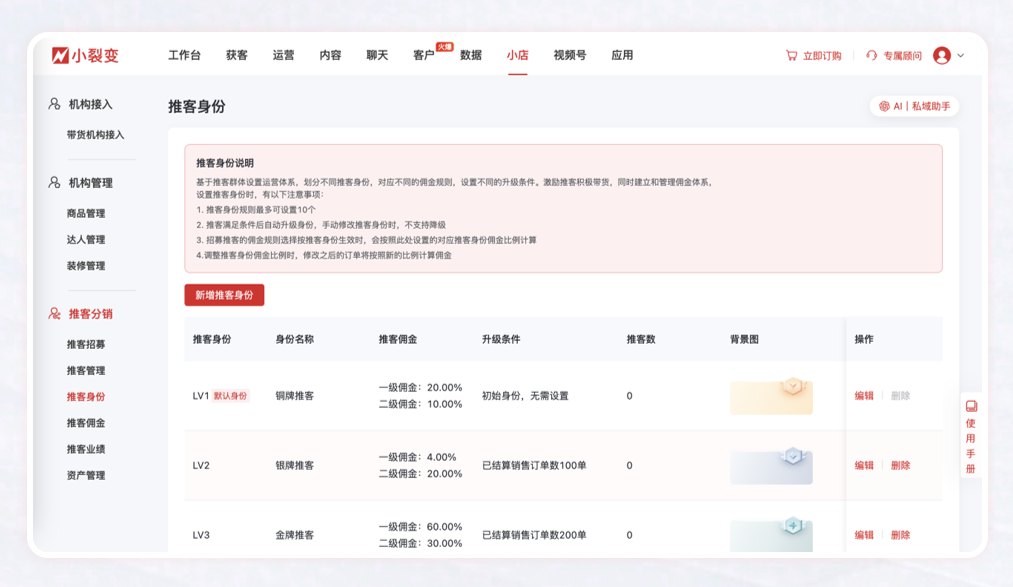 通过推客身份玩法,带货机构可设置佣金规则、升级条件、身份权益等,建立推客身份体系。推客身份等级越高,佣金比例越高,不同等级还可享受对应的身份权益,激励推客主动参与分销带货,不断升级推客身份。