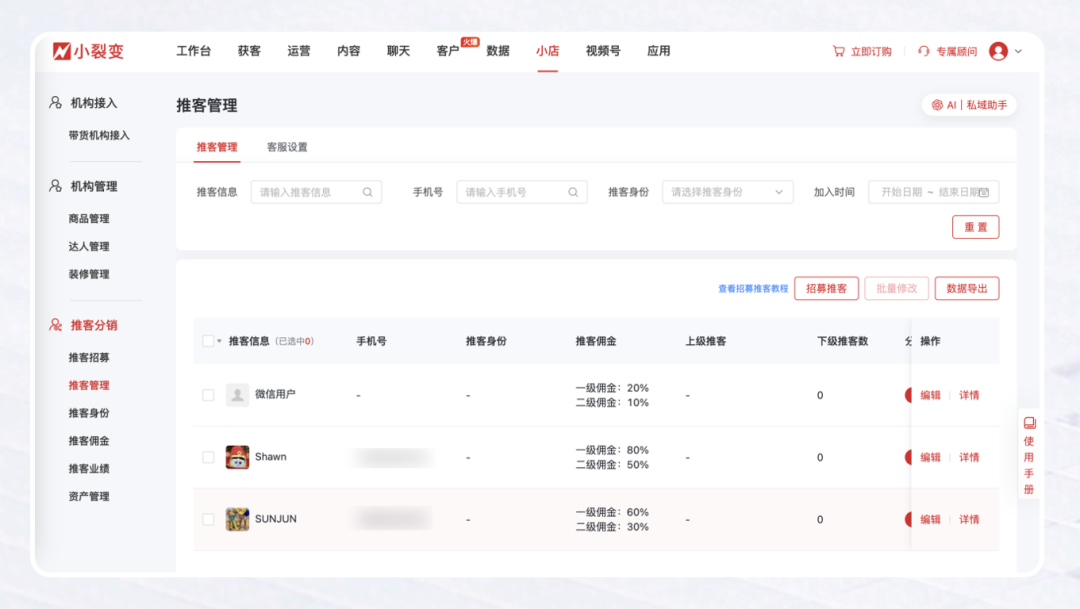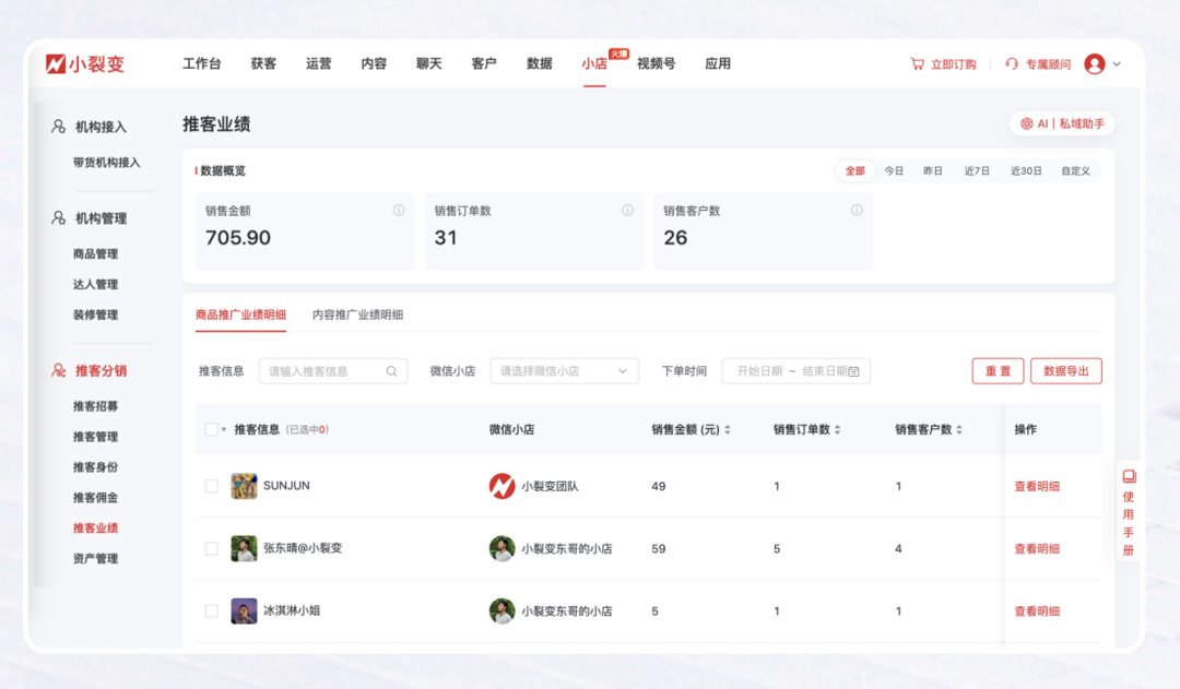 通过小裂变·推客分销系统,带货机构可根据推客佣金发放情况和推客业绩,筛选出带货能力强的推客。