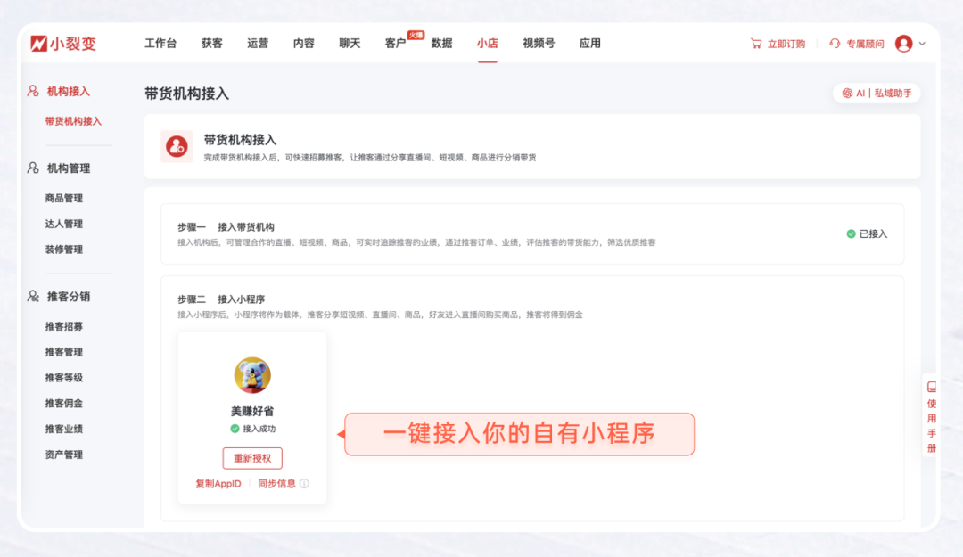 带货机构接入小裂变·推客分销系统,仅需完成接入带货机构和接入小程序两个步骤。