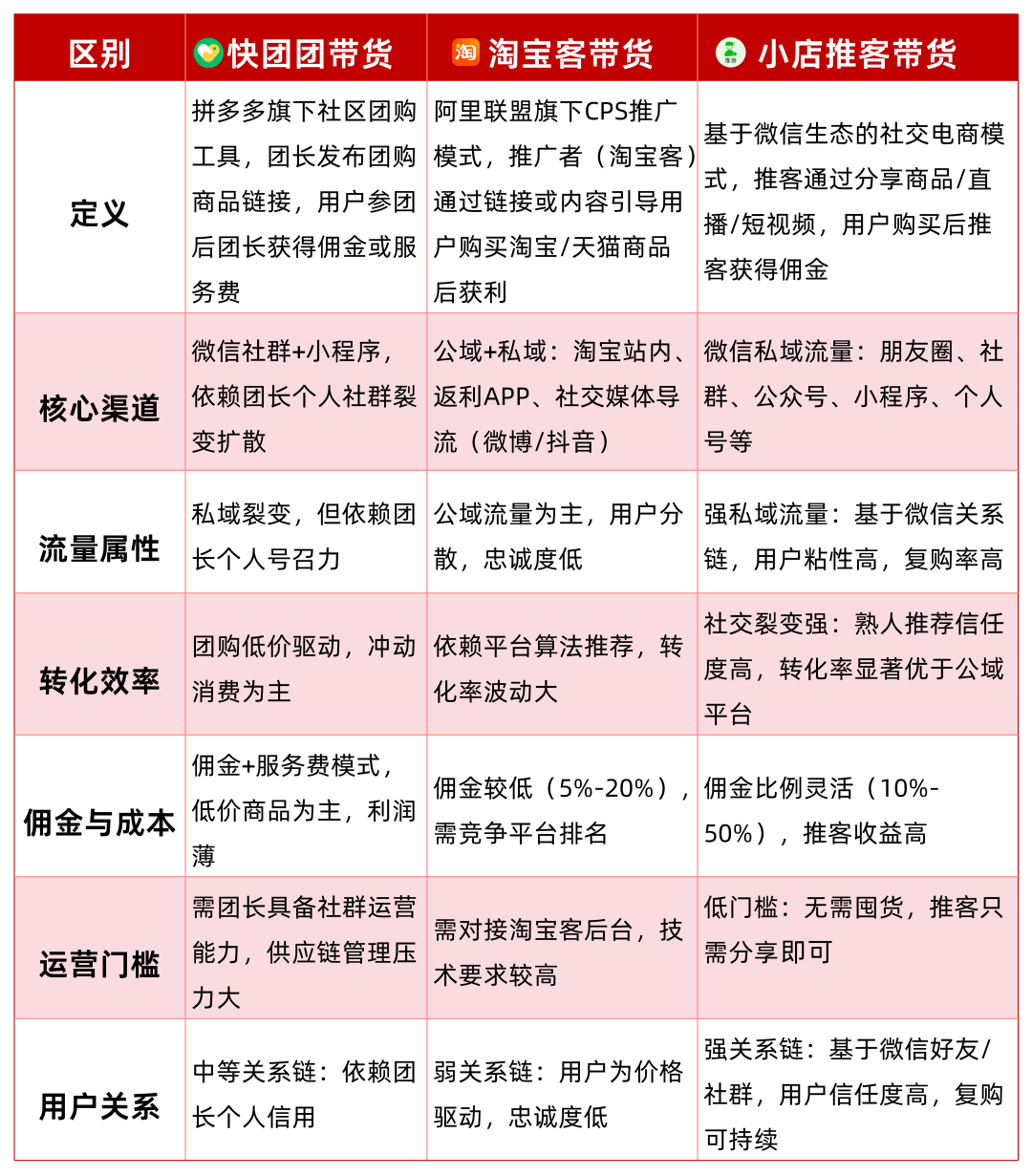 1)私域团长带货、淘宝客带货VS小店推客带货