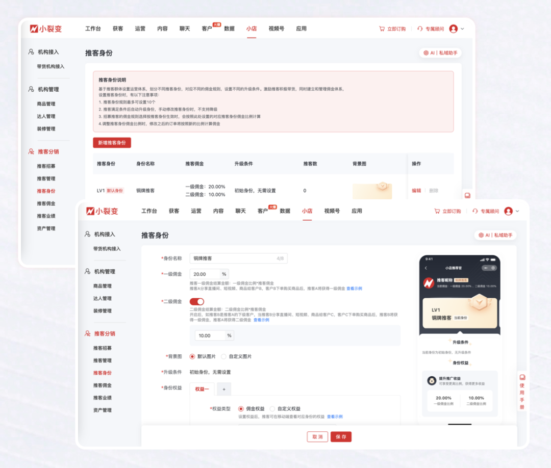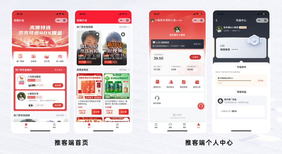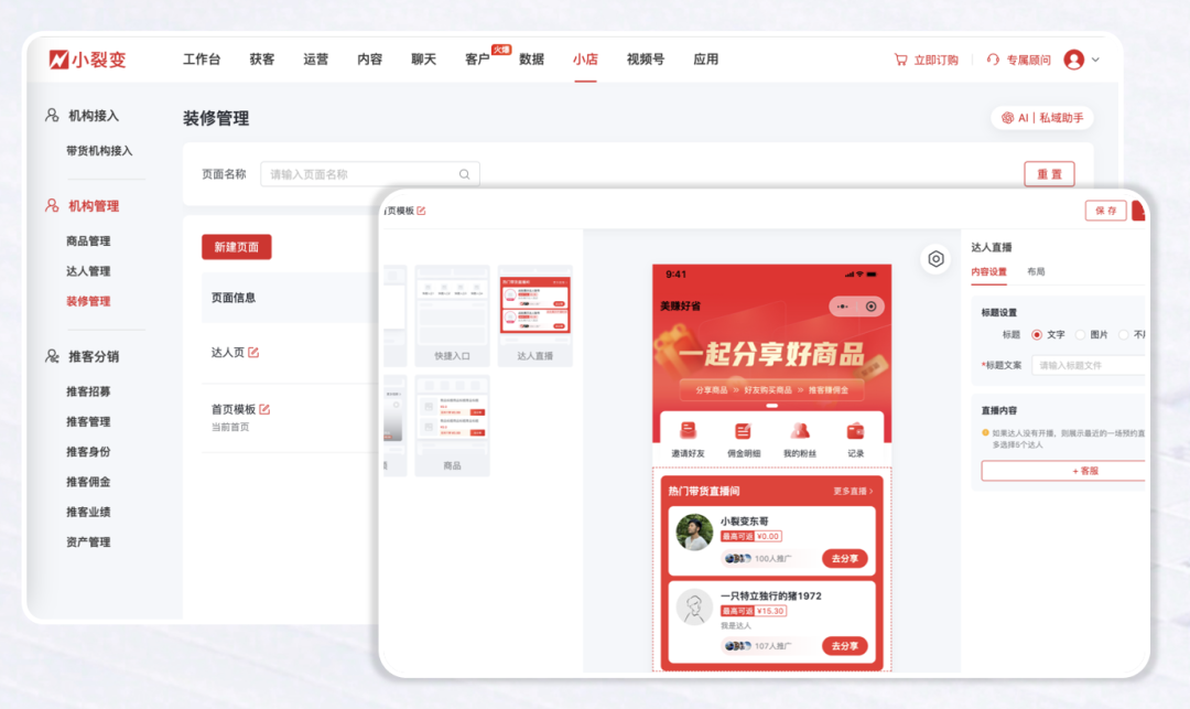小裂变·推客分销系统机构版,旨在帮助带货机构搭建自有推客分销小程序。